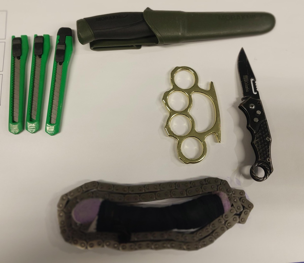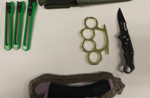 Bei der Durchsuchung des Autos wurden durch die eingesetzten Bundespolizisten im Handschuhfach griffbereit ein verbotener Schlagring, ein verbotenes Springmesser, eine zum Schlagwerkzeug umfunktionierte Antriebskette, ein Jagdmesser und drei Cuttermesser aufgefunden und sichergestellt.