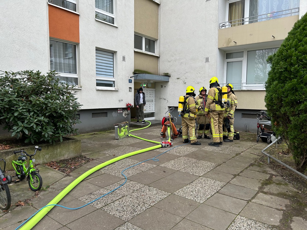 Als die ersten Einsatzkräfte dort eintrafen, hatten die Bewohner das Haus bereits verlassen. Flammen hatten bereits die Scheiben zum Bersten gebracht und das Feuer bahnte sich seinen Weg ins Innere der Wohnung. Die Einsatzkräfte setzten ein Löschrohr von außen ein und legten parallel eine weitere Leitung und einen Verteiler vor das Gebäude, daran schlossen sie ein zweites Löschrohr für den Innenangriff an. Als das Feuer gelöscht war, wurde die Wohnung maschinell mit einem Hochdrucklüfter belüftet. Die beiden Bewohner der Wohnung, die in der Anfangsphase des Brandes noch einen Löschversuch unternommen hatten, wurden durch den Rettungsdienst untersucht und verblieben aber dann nach ambulanter Behandlung an der Einsatzstelle.