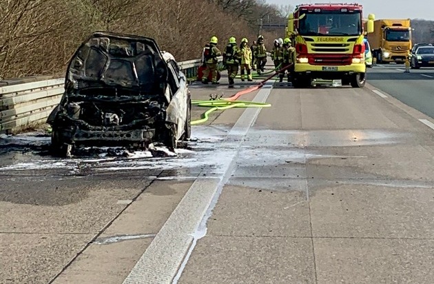 Auf der Autobahn 3 zwischen Breitscheid und Duisburg-Wedau geriet am heutigen Mittag gegen 14:45 Uhr ein Pkw im Motorbereich in Vollbrand. Kurz nach der Alarmierung erreichten Einsatzkräfte der Feuerwehr die Einsatzstelle, an der das Fahrzeug bereits in Flammen stand. Der Löschzug Breitscheid sowie die Berufsfeuerwehr der Feuerwache 2 konnten den Brand zügig unter Kontrolle bringen und löschen. Während der Löscharbeiten wurde ein Kind mit Verdacht auf Rauchgasvergiftung vom Rettungsdienst der Städte Ratingen und Heiligenhaus medizinisch versorgt und konnte abschließend in die Hände von Angehörigen übergeben werden. Ein Transport in ein Krankenhaus wurde glücklicherweise nicht notwendig. Die rechte Fahrspur der Autobahn war während des Einsatzes zeitweise gesperrt, um die Sicherheit der Einsatzkräfte und Verkehrsteilnehmer zu gewährleisten. Die Brandursache wird derzeit von der Polizei ermittelt.