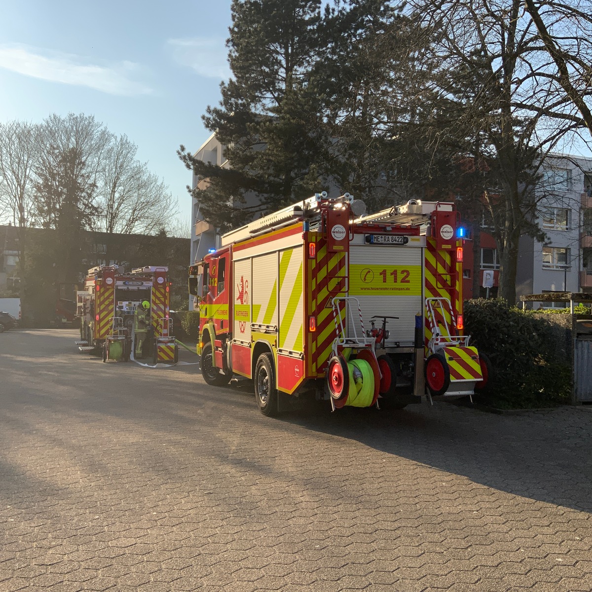 Am 19. März 2026 wurde die Feuerwehr um 16:35 Uhr zu einem Zimmerbrand in die Straße Bleicherhof in Ratingen Mitte alarmiert. Ein ausgelöster Rauchwarnmelder hatte Nachbarn aufmerksam gemacht, die daraufhin Brandgeruch wahrnahmen und umgehend die Feuerwehr verständigten. Beim Eintreffen der Einsatzkräfte war eine deutliche schwarze Verrauchung der betroffenen Wohnung durch die Fenster erkennbar. Die Bewohnerin, die kurz zuvor nach Hause gekommen war, wies die Feuerwehr ein. Personen befanden sich nicht mehr in der Wohnung, jedoch wurde eine Katze vermisst. Die Feuerwehr begann umgehend mit einem Innenangriff unter Einsatz eines Löschrohres zur Brandbekämpfung, während parallel an der Gebäuderückseite eine Drehleiter in Stellung gebracht wurde. Das Feuer konnte schnell gelöscht und auf die betroffene Wohnung begrenzt werden. Eine Bewohnerin wurde mit Verdacht auf eine leichte Rauchgasvergiftung vor Ort medizinisch versorgt. Die vermisste Katze kam bei dem Brand leider ums Leben. Aufgrund der starken Rauchentwicklung ist die Wohnung derzeit unbewohnbar. Die Brandstelle wurde von der Polizei beschlagnahmt und wird nun weiter untersucht. Der Einsatz dauerte rund eine Stunde. Im Einsatz waren die Berufsfeuerwehr beider Standorte, der Löschzug Mitte, der Rettungsdienst der Städte Ratingen und Heiligenhaus, der Notarzt vom Standort Ratingen sowie die Polizei des Kreises Mettmann. Insgesamt waren rund 30 Einsatzkräfte beteiligt. Die Feuerwehr weist eindringlich auf die lebensrettende Bedeutung von Rauchwarnmeldern hin und empfiehlt deren regelmäßige Wartung und Prüfung.
