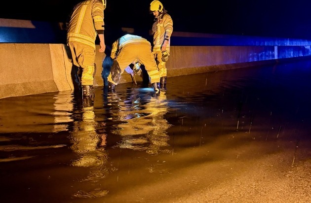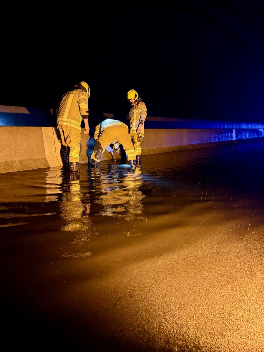 In den frühen Morgenstunden des 19. April wurde die Feuerwehr Ratingen um 03:08 Uhr zu einem Verkehrsunfall auf der Bundesautobahn 3 in Fahrtrichtung Köln alarmiert. Die Unfallstelle lag zwischen dem Autobahnkreuz Breitscheid und dem Autobahnkreuz Ratingen-Ost. Erste Meldungen berichteten von einer eingeklemmten Person, was sich beim Eintreffen der Einsatzkräfte glücklicherweise nicht bestätigte. Zwei PKW waren beteiligt, deren Trümmer sich über rund 200 Meter verteilten. Zusätzlich hatte sich auf der linken Fahrspur Regenwasser in etwa 15 Zentimetern Höhe auf einer Länge von circa 120 Metern angesammelt. Besondere Gefahr ging von einem herausgerissenen Fahrzeugrad aus, das mehrere hundert Meter über die Fahrbahn geschleudert wurde. Die Feuerwehr sicherte die Unfallstelle gemeinsam mit der Polizei ab und stellte den Brandschutz sicher. Auslaufende Betriebsstoffe wurden aufgenommen. Um die Wasseransammlung zu beseitigen, befreiten die Einsatzkräfte sieben verstopfte Wasserabläufe von Morast, sodass das Wasser abfließen konnte. Der Rettungsdienst versorgte zwei leicht verletzte Personen, die an der Einsatzstelle verbleiben konnten. Eine Feuerwehrkraft zog sich während der Maßnahmen eine leichte Handverletzung zu. Beide Fahrzeuge waren nicht mehr fahrbereit und wurden durch ein Bergeunternehmen abgeschleppt. Der Einsatz dauerte von 03:08 bis etwa 05:30 Uhr. Anschließend übergab die Feuerwehr die Einsatzstelle an die Autobahnpolizei. Im Einsatz waren Kräfte der Berufsfeuerwehr Ratingen von beiden Standorten, der Führungsdienst, Einheiten der Freiwilligen Feuerwehr Homberg und Mitte sowie der Rettungsdienst der Städte Ratingen und Heiligenhaus mit zwei Rettungswagen und einem Notarzt des Kreises Mettmann. Die Autobahnpolizei war ebenfalls vor Ort. Zur Schadenshöhe liegen keine Angaben vor.