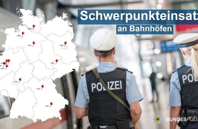 Nachstehende Übersicht zeigt eine Auswahl von Bahnhöfen, an denen die Bundespolizei Schwerpunktmaßnahmen trifft (siehe Bild).