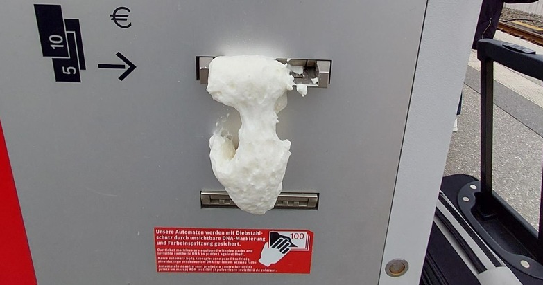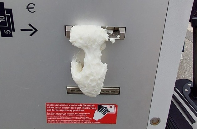 Bundespolizisten wurden durch einen Hinweisgeber auf den Umstand aufmerksam gemacht und nahmen den Automaten vor Ort in Augenschein. Die Beamten fanden einen Automaten vor, dessen Münzeinwurf, Geldeinzug und Ausgabeschacht mit herkömmlichen Bauschaum befüllt und verdichtet waren. Der Schaum war bereits vollständig ausgehärtet, sodass der Tatzeitraum einige Stunden zurückliegen musste.