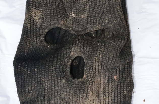 Anhand des vorliegenden Bildmaterials aus der Überwachungskamera konnte die gefundene Bekleidung den beiden Räubern wie folgt zugeordnet werden: