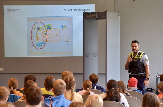 Nach einem spannenden Vormittag an der Hochschule des Bundes für öffentliche Verwaltung, Fachbereich Bundespolizei in Lübeck, gingen die MiniMASTERKinder mit vielen neuen Eindrücken rund um das Thema Fliegen nach Hause. Unter dem Motto "Sicher am Flughafen - die Bundespolizei zeigt dir, wie das geht und warum es wichtig ist" nahmen Dozentinnen und Dozenten des Fachbereichs Bundespolizei den Weg eines Fluggastes vom Betreten des Terminals bis zum Abflug genau unter die Lupe. Schritt für Schritt wurde verständlich gemacht, warum Ausweis- und Sicherheitskontrollen nötig sind, welche Rolle die Bundespolizei dabei spielt und wie sie dafür sorgt, dass alle Reisenden sicher unterwegs sind. Nach dem Vortrag ging es für die Kinder und ihre Familien vom Hörsaal direkt hinein in die Praxis: Im Bundespolizeimuseum konnten sie Exponate aus der Geschichte der Bundespolizei entdecken und sehen, wie sich Aufgaben, Uniformen und Ausstattung im Laufe der Jahrzehnte verändert haben. Draußen wartete der nächste Höhepunkt: Einsatzfahrzeuge der Bundespolizei standen bereit, durften von innen erkundet und ausgiebig "erklommen" werden. Begleitet und unterstützt wurde die Veranstaltung von Studierenden der Bundespolizei, die nicht nur bei der Betreuung halfen, sondern den MiniMasterKindern auch aus ihrem Studienalltag erzählten. So ergaben sich viele kleine Gespräche auf Augenhöhe darüber, wie man Polizistin oder Polizist bei der Bundespolizei wird und welche Aufgaben im Studium auf die angehenden Beamtinnen und Beamten warten. Wer nach diesem Einblick Lust auf noch mehr Bundespolizei bekommen hat, sollte sich bereits jetzt den 30. Mai vormerken: Anlässlich "75 Jahre Bundespolizei" lädt die Bundespolizeiakademie in Lübeck zu einem großen Tag der offenen Tür unter dem Motto "Bundespolizei früher, heute - wer Teil der Zukunft?" ein.