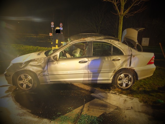 Ein 45 Jahre alter Mann aus Merzenich befuhr gegen 22:25 Uhr mit seinem Pkw die L 264 aus Richtung Arnoldsweiler in Richtung Girbelsrath. In Höhe der dortigen Kreuzung beabsichtigte er, nach rechts in den Steinweg abzubiegen. Hierbei verlor er die Kontrolle über seinen Wagen. Er prallte gegen die Bordsteinkante einer Verkehrsinsel und im weiteren Verlauf gegen drei Masten. Am Ende kippte das Auto auf die linke Fahrzeugseite, auf der es liegen blieb.