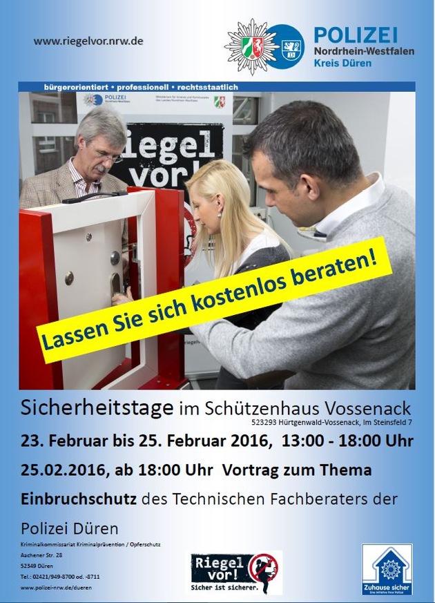 Im Zeitraum von Dienstag, dem 23. Februar 2016, bis Donnerstag, dem 25. Februar 2016, jeweils von 13:00 Uhr bis 18:00 Uhr finden unter der Leitung des Technischen Fachberaters des Kriminalkommissariats für Kriminalprävention und Opferschutz, Herr Kriminalhauptkommissar Dietmar Schorn, die Sicherheitstage statt. Handwerker aus der Region, die sogenannten Netzwerkpartner der Schutzgemeinschaft Rureifel, werden die Veranstaltung begleiten, Exponate bereit halten und ausführlich über technische Möglichkeiten unverbindlich informieren.