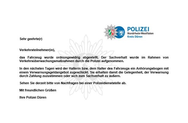 Die Kreispolizeibehörde Düren möchte darüber informieren, dass ab dem 01.04.2016 Parkverstöße geahndet werden, indem zunächst am betroffenen Fahrzeug eine Mitteilung über die beabsichtigte Ahndung des festgestellten Verstoßes hinterlassen wird. Diesem Beleg ist zu entnehmen, dass dem Halter oder der Halterin in den nächsten Tagen ein Anhörungsbogen mit einem Verwarnungsgeldangebot zugeschickt werden wird. Der altbekannte Überweisungsträger wird also nicht mehr unter dem Scheibenwischer angebracht.