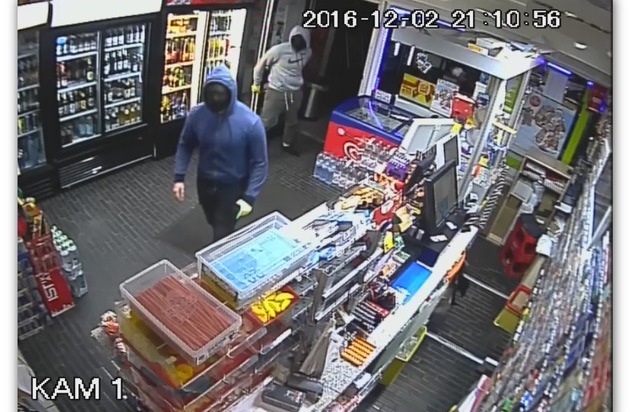Mit einer vorgehaltenen, schwarzen Schusswaffe bedrohte das Duo einen Angestellten gegen 20:00 Uhr und versuchte auch, den Mann durch Tritte zu verletzen. Dieser jedoch schrie die Räuber an, so dass sie letztlich aus dem Laden flüchteten, ohne Beute gemacht zu haben. Die beiden Flüchtigen, die Richtung Oststraße liefen, konnten dabei als etwa 180 cm groß beschrieben werden. Die Bekleidung ist auf dem nun veröffentlichten Bild gut zu erkennen.