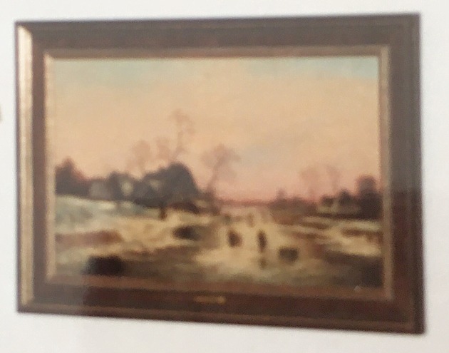 Foto 1: Querformat, ca. 50x80 cm: Winterlandschaft in den Niederlanden mit Schlittschuhläufern auf einem zugefrorenen See. An beiden Seiten des Sees befinden sich Häuser. Im Vordergrund Darstellung eines Schlittens auf dem Eis (Ende 19. Jahrhundert)