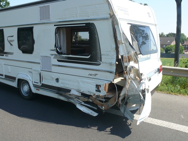 Zur Unfallzeit war ein 60-Jähriger aus Hückelhoven mit seinem Pkw samt Wohnanhänger auf der B 55 aus Richtung Autobahn kommend in Richtung Welldorf unterwegs. In einer Rechtskurve geriet der Anhänger ins Schleudern und drehte sich quer zur Gegenfahrbahn. Hier war zu dem Zeitpunkt ein 66-Jähriger aus Lingen mit seinem Wohnmobil unterwegs. Sein Fahrzeug und der Wohnanhänger stießen zusammen. Durch den Unfall wurden sowohl der 66-Jährige als auch seine 63-jährige Beifahrerin verletzt. Beide mussten mit RTW in umliegende Krankenhäuser gebracht werden. Der Fahrer des Pkw und seine Beifahrerin hingegen kamen mit dem Schrecken davon und blieben unverletzt. Es entstand Sachschaden in Höhe von circa 12000 Euro. Für die Dauer der Unfallaufnahme musste die B 55 zwischen der Anschlussstelle Jülich-Mersch und der Einmündung L 241 voll gesperrt werden.