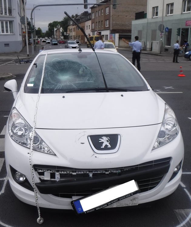 Während das Rad an der Anstoßstelle liegen blieb, wurde die 20-Jährige auf die Motorhaube aufgeladen. Dabei prallte sie mit dem Kopf gegen die Frontscheibe und fiel zu Boden, als das Auto der Unfallverursacherin im Kreuzungsbereich, unmittelbar vor der Einfahrt zur August-Klotz-Straße, zum Stehen kam.