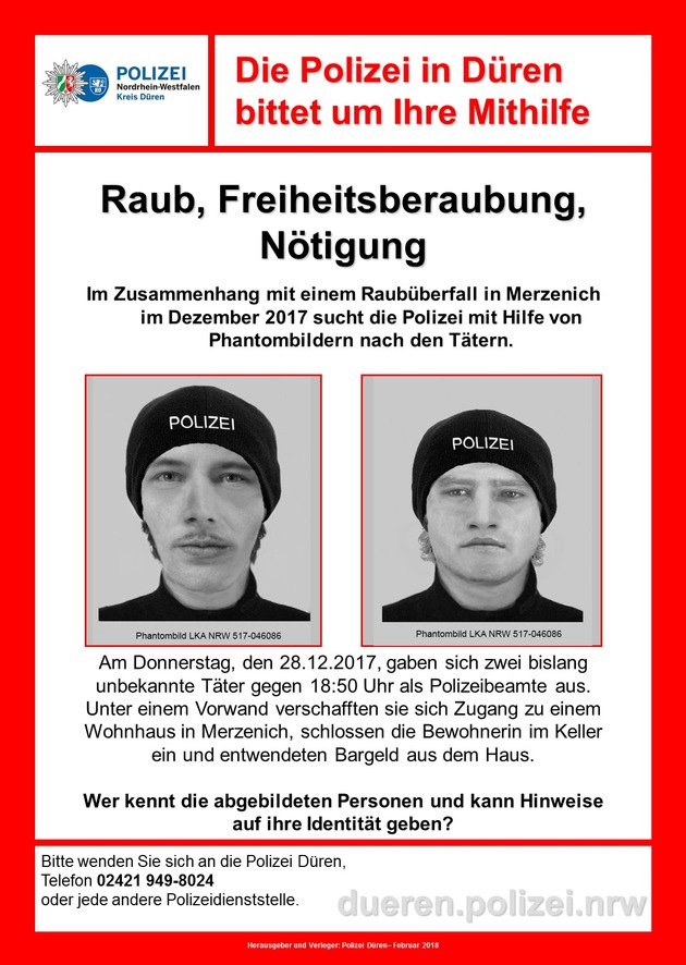 Mit Phantombildern sucht die Dürener Polizei nun nach den beiden Männern. Hinweise auf die Tatverdächtigen nimmt die sachbearbeitende Dienstelle unter der Rufnummer 02421 949-8024 oder jede andere Polizeidienststelle entgegen.