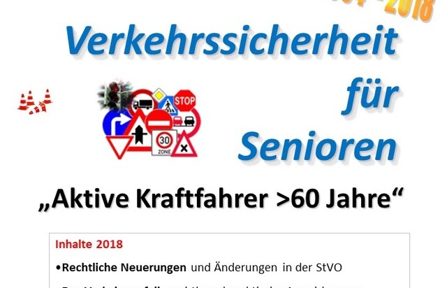 Ab dem 15.02.2018 nehmen die Verkehrssicherheitsberater wieder Anmeldungen für dieses Seminarangebot entgegen. Themenschwerpunkte im Jahr 2018 werden das aktuelle Verkehrsrecht, rechtliche und praktische Auswirkungen eines Verkehrsunfalles, aktuelle Beleuchtungssysteme an und in Pkw sowie Informationen rund um das Thema Umweltzonen sein. Außerdem wird ein Fahr- und Sicherheitstraining als Schnupperkurs sowie mit Unterstützung der Verkehrswacht Jülich ein Seh- und Reaktionstest angeboten. Die Kurse werden sowohl in Jülich als auch in Düren angeboten. Sie beginnen jeweils um 15:00 Uhr und dauern circa 90 Minuten. Die Teilnahme an den Veranstaltungen ist grundsätzlich kostenlos. Lediglich für den praktischen Übungstag werden die dafür entstehenden Kosten anteilig auf die Anzahl der Teilnehmer umgelegt.