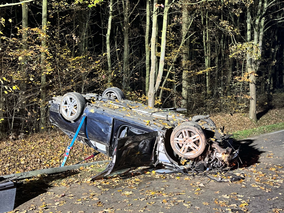 Eine Pkw-Fahrerin kam am Samstag (08.11.2025) von der K28 ab, prallte gegen einen Baum und landete auf dem Dach. Sie verletzte sich schwer.