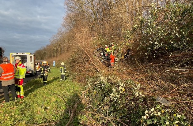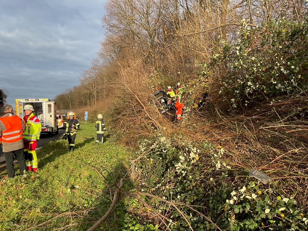 Am heutigen Vormittag gegen 10:23 Uhr wurde der Leitstelle der Feuerwehr ein Verkehrsunfall auf der Bundesautobahn 40 in Fahrtrichtung Duisburg gemeldet. Ein Personenkraftwagen war von der Fahrbahn abgekommen und im dichten Bewuchs des Seitenstreifens zum Stehen gekommen. Aufgrund der Meldung wurde umgehend der Rüstzug der Feuerwehr zur Einsatzstelle entsandt. Beim Eintreffen der ersten Einsatzkräfte bestätigte sich die gemeldete Lage: Ein PKW war aus bislang ungeklärter Ursache von der Fahrbahn abgekommen und etwa 20 Meter tief in den dichten Gebüschstreifen gefahren. Vorbildlich handelnde Ersthelfer betreuten den Insassen bis zum Eintreffen der Einsatzkräfte.