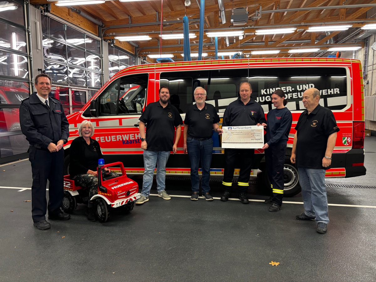 Große Freude herrschte am vergangenen Montag (17.11.2025) bei der Freiwilligen Feuerwehr Kaarst: Das Schützenkönigshaus 2025 hat dem Feuerwehrnachwuchs eine großzügige Spende überreicht. König Wilfried Schmitz (Wilfried I.) und Königin Anneliese übergaben zusammen mit ihren Ministern Uwe Siegel und Steffen van der Ploeg einen Scheck in Höhe von 2.000 Euro an die Leitung der Feuerwehr. Das Königshaus hatte im Rahmen des Schützenfestes darum gebeten, auf persönliche Geschenke und Blumen zu verzichten und stattdessen für den guten Zweck der Kinderfeuerwehr zu spenden.