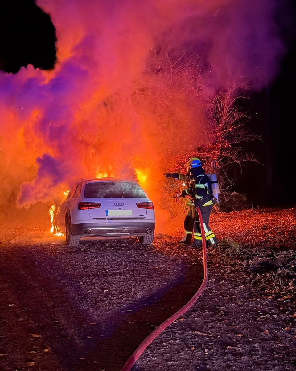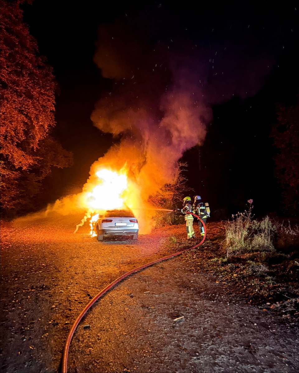 Kaum vier Minuten später, um 21:38 Uhr, wurde die Löschgruppe Hiddesen zu einem gemeldeten Pkw-Brand an der Lopshorner Allee gerufen. Beim Eintreffen der Einsatzkräfte stand der Betroffene Audi bereits in Vollbrand. Zwei Trupps leiteten die Brandbekämpfung ein und konnten das Feuer schnell unter Kontrolle bringen. Zusätzlich wurde der Pkw mit Schaum abgelöscht, um letzte Glutnester zu ersticken. Abschließend wurde eine Wärmebildkamera zur Kontrolle vorgenommen.
