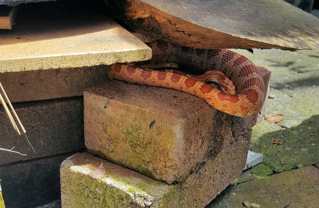 Eine Anwohnerin der Charlottenstraße fand am frühen Freitagnachmittag eine Schlange (Bild) in ihrem Hinterhof und alarmierte die Polizei. Die Beamten konnten das etwa einen halben Meter lange Tier problemlos einfangen und mit aufs Revier nehmen. Von einer fachkundigen Person konnte in Erfahrung gebracht werden, dass es sich um eine ungiftige Kornnatter handelt, die augenscheinlich gerade zwei Mäuse vertilgt und sich deshalb zum Verdauen ein warmes Plätzchen gesucht hatte. Die Polizei konnte das Tier vorläufig artgerecht in einem Zoogeschäft unterbringen und sucht jetzt den Besitzer. Hinweise bitte unter Telefon 0 63 31 / 5 20 - 0 an die Polizeiinspektion Pirmasens.