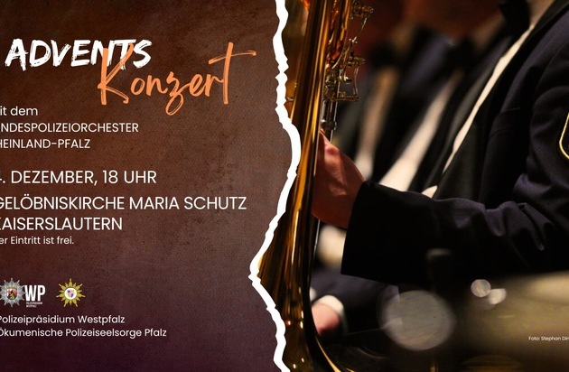 Der Beirat der Ökumenischen Polizeiseelsorge Pfalz und das Polizeipräsidium Westpfalz veranstalten zusammen mit dem Landespolizeiorchester Rheinland-Pfalz am 4. Dezember 2024, um 18 Uhr, in der Gelöbniskirche Maria Schutz in Kaiserslautern ein Adventskonzert. Alle Bürgerinnen und Bürger sind herzlich eingeladen. Der Eintritt ist frei.