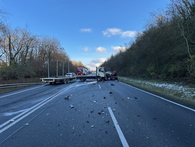 Am 21.11.25, gegen 13.55 Uhr befuhr ein 60-jähriger LKW Fahrer die B 10 in Fahrtrichtung Landau, hinter dem LKW befand sich ein Anhänger (Gliederzug). Aus bislang ungeklärter Ursache kam der LKW Fahrer, ca. 500 m nach der Auffahrt Albersweiler, nach links auf die Gegenfahrbahn. Dort kam es zum Frontalzusammenstoß mit einem entgegenkommenden Pkw. Dessen 73-jährige Fahrerin, sowie der LKW Fahrer wurden verletzt und zur weiteren Abklärung in Krankenhäuser verbracht. Es entstand Sachschaden von rund 55.000 EUR. Die B 10 war für ca. 3 Stunden in beide Richtungen gesperrt, es kam zu erheblichen Rückstaus.