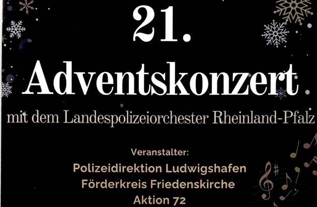 Am Mittwoch, den 26.11.2025, um 19 Uhr, findet das 21. Benefiz-Adventskonzert mit dem Landespolizeiorchester Rheinland-Pfalz in der Friedenskirche in Ludwigshafen-Friesenheim statt. Das Konzert wird gemeinsam von "Aktion 72 e.V.", "Förderkreis der Friedenskirche e.V." und der Polizeidirektion Ludwigshafen veranstaltet.
