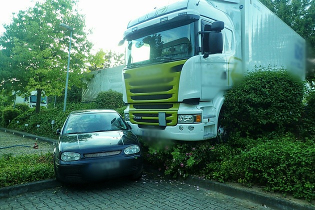 Anschließend rollt der LKW über die Robert-Koch-Straße und schiebt einen am rechten Fahrbahnrand geparkten, unbesetzten PKW über den Bordstein eine Böschung hinab. Der LKW kommt an der Böschung zum Stillstand.