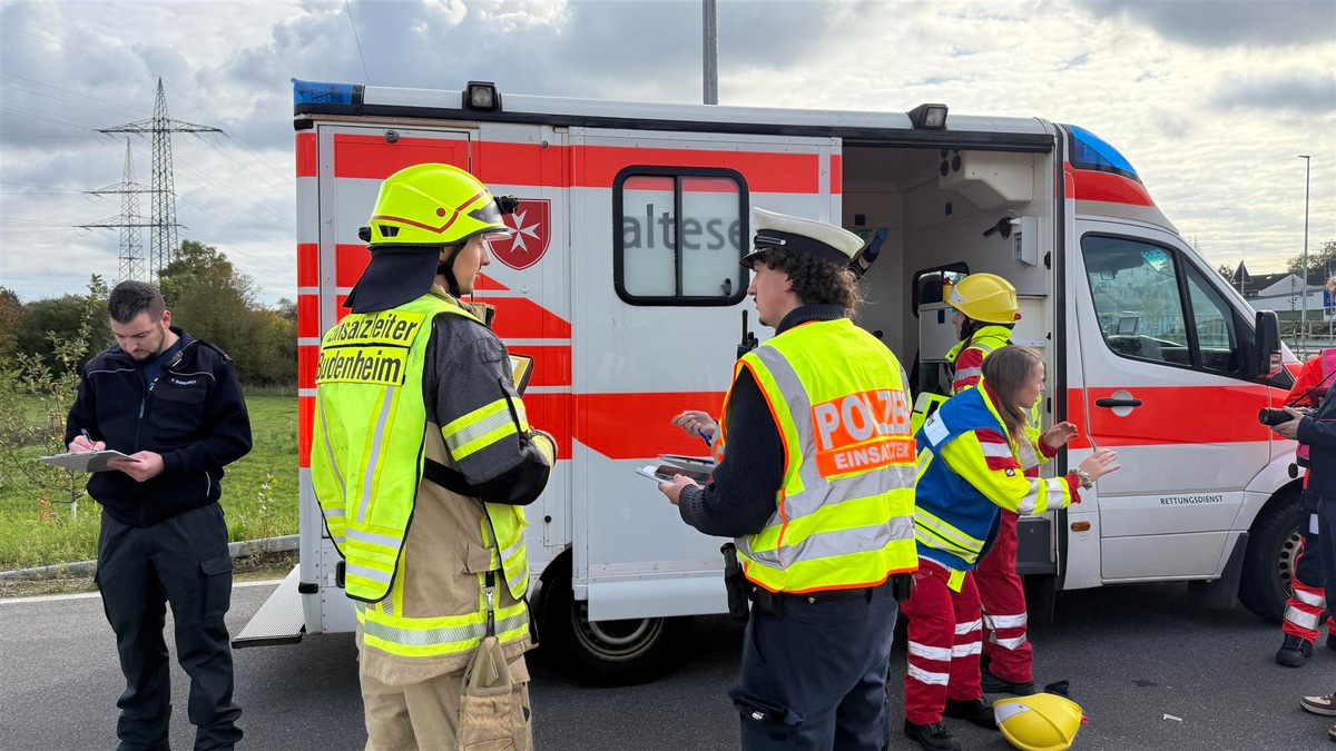 Über 50 Einsatzkräfte von Feuerwehr, Rettungsdienst und Polizei haben am Samstag, 18.10.2025, bei einer Gemeinschaftsübung in Budenheim den Ernstfall geprobt.