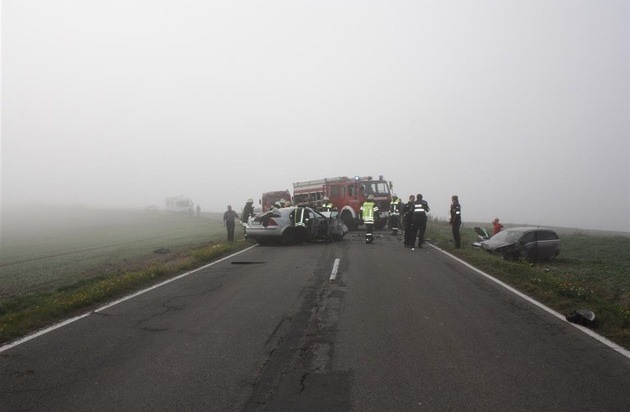 Tödlicher Verkehrsunfall (Fotoaufnahmen: Am 01.11.2015, um 13;22 h wurde der PI Mayen ein Verkehrsunfall mit einer eingeklemmten Person auf der L 52 zwischen Minkelfeld und Ochtendung gemeldet. Sofort wurden ein Notarzt und zahlreiche Rettungskräfte an die Unfallstelle entsandt. Nach ersten Ermittlungen befuhr ein 74-jähriger Mann aus Bad Neuenahr-Ahrweiler mit seinem Pkw, die L 52 von Minkelfeld in Fahrtrichtung Polch. Im Verlauf einer Rechtskurve geriet der Fahrzeugführer aus bislang ungeklärter Ursache auf die Gegenfahrbahn und kollidierte dort mit einem entgegenkommenden Pkw. Beim Unfallhergang wurde der 74-jährige Fahrzeugführer in seinem Kfz eingeklemmt und verstarb noch an der Unfallstelle. Das Fahrzeug des Gegenverkehrs wurde nach rechts von der Fahrbahn geschleudert und kam in einem angrenzenden Feld zum Stehen. Die Fahrzeuginnsassen, ein Ehepaar aus Koblenz kam mit schweren Verletzungen ins Bundeswehrzentralkrankenhaus. Zum Unfallzeitpunkt war die Sicht durch Nebel an der Unfallstelle beeinträchtigt. Die Staatsanwaltschaft Koblenz beauftragte einen Verkehrsgutachter zur Klärung der Unfallursache. Hierbei kam auch ein Polizeihubschrauber zum Einsatz. An der Unfallstelle konnten zahlreiche Unfallspuren gesichert werden, die der Auswertung bedürfen. Die am Unfall beteiligten Fahrzeuge wurden sichergestellt. Die L 52 war während der Unfallaufnahme für 1,5 Stunden voll gesperrt.