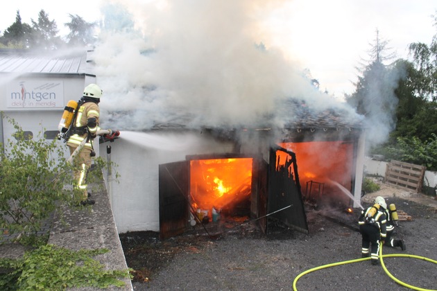 Am 15.07.2017 gegen 20:34 Uhr kam es in der Mühlenstraße in Mendig zum Vollbrand einer Garage. Durch das schnelle und professionelle Eingreifen der Feuerwehren aus Mendig, Thür und Volkesfeld konnte ein Übergreifen auf eine benachbarte Garage verhindert sowie das Feuer schnell unter Kontrolle gebracht werden. Die betroffene Garage, welche zu einem leerstehenden Wohnhaus gehörte, wurde durch den Brand jedoch völlig zerstört. Die starke Rauchentwicklung über Mendig war kilometerweit zu erkennen, Personen kamen glücklicherweise nicht zu Schaden. Nachlöscharbeiten zogen sich bis in die Nacht hinein.