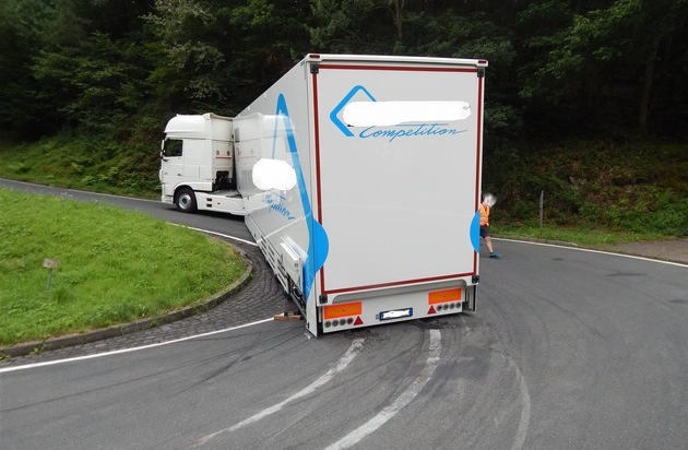 Am Mittwoch, den 02.08.2017, gegen 17:30 Uhr, fuhr sich ein Sattelzug eines Rennteams aus Südtirol (Italien) auf der K 14 zwischen dem Nettetal und dem Ort Langefeld fest. Der Auflieger des Sattelzuges setzte in der ersten Serpentine der kurvenreichen Steigungsstrecke Richtung Langenfeld so auf, dass der Sattelzug weder nach vorne noch zurück fahren konnte. Teile der Karosserie gruben sich in den Fahrbahnbelag ein, so dass ein Schaden am Auflieger sowie an der Fahrbahn entstand. Der Gesamtschaden beläuft sich auf ca. 5.000 EUR. Der Sattelzug musste durch ein Abschleppunternehmen mittels Hebetechnik befreit werden. Es folgten langwierige Rangiermanöver. Die K 14 war bis 19:45 Uhr voll gesperrt. Der Sattelzug, welcher eigentlich von der A 61, Anschlussstelle Wehr, zum Nürburgring fahren wollte, hatte sich auf der Umleitungsstrecke von Wehr kommend im Bereich Weibern verfahren, und war dann von seinem Navigationsgerät über Weibern, Hausten und Langenfeld in Richtung Nürburgring gelotst worden.