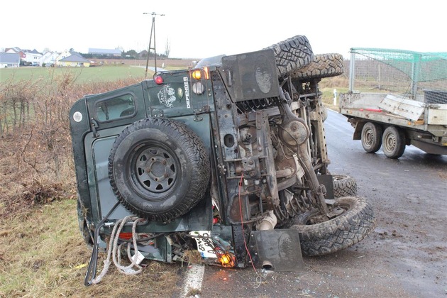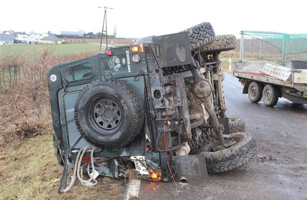 Am 10.3.18, 08:38 Uhr befuhr ein 32jähriger mit einem Geländewagen mit Anhänger die L 79 aus Richtung Remagen kommend in Richtung Birresdorf. Beim Durchfahren einer leichten Linkskurve brach der Hänger nach rechts aus, riss vom Zugfahrzeug ab und rutschte in den Graben. Der PKW wurde zunächst durch den Hänger mitgerissen, überschlug sich dann und kam auf der Seite liegend zum Stillstand. Durch den Überschlag wurde ein 31jähriger Mitfahrer leicht verletzt. Er wurde durch den Rettungsdienst an der Unfallstelle versorgt und anschließend in das Krankenhaus Remagen verbracht. Der Sachschaden beläuft sich auf ca. 5000 Euro