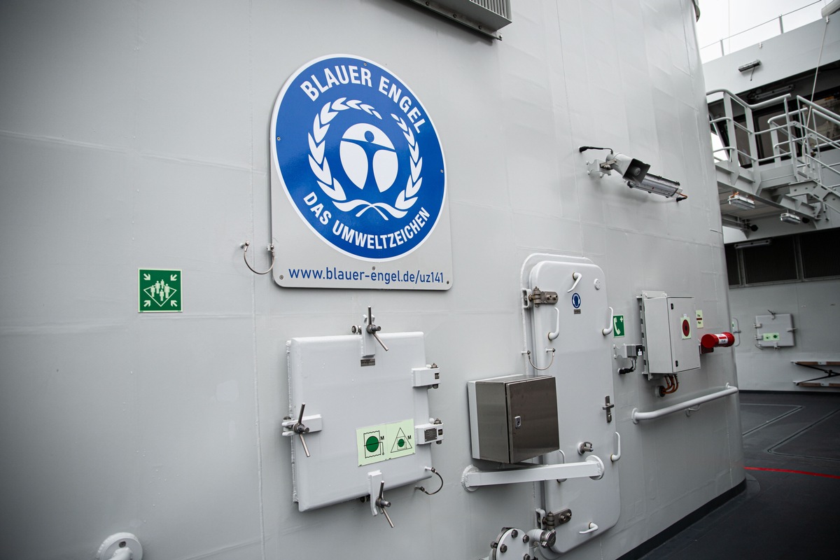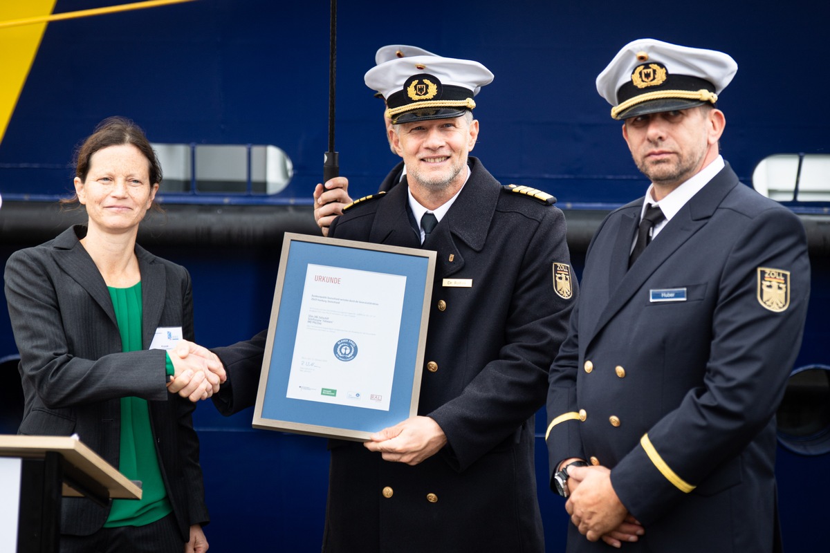 Besonders hervorzuheben ist, dass das neue Zollschiff mit dem Umweltzeichen "Blauer Engel" ausgezeichnet wurde. Diese Auszeichnung, die weltweit bislang nur sehr wenigen Schiffen verliehen wurde, unterstreicht das Engagement des Zolls für nachhaltige und umweltfreundliche Technologien. Auch die in diesem Jahr bereits in Dienst gestellten LNG-Zollschiffe "Rügen" und "Emden" tragen dieses Umweltzeichen.
