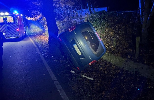SI / Bielefeld / Jöllenbeck - Ein Pkw-Fahrer war in der Nacht auf Freitag, 07.11.2025, betrunken auf der Beckendorfstraße unterwegs, wo er eine Verkehrsinsel überfuhr und schließlich im Graben landete. Er verletzte sich leicht.
