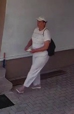 - weibliche Person - mittleres Alter - weiße Hose - weißes Oberteil - weißes Basecap - rosa Halbschuhe - schwarze Umhängetasche.