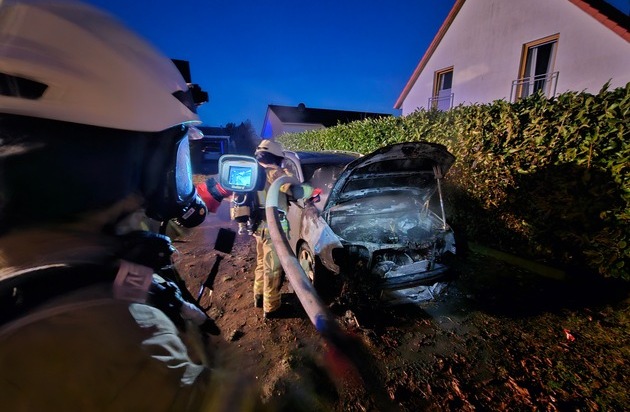 Beim Eintreffen der Einsatzkräfte stand der Pkw bereits in Vollbrand. Aufgrund der unmittelbaren Nähe zu einer Hecke und einem Wohnhaus bestand die akute Gefahr einer Brandausbreitung; das Feuer hatte bereits begonnen auf die Hecke überzugreifen. Durch das schnelle und gezielte Eingreifen der Feuerwehr konnte jedoch ein komplette Brandausbreitung der Flammen über die Hecke auf das angrenzende Haus erfolgreich verhindert werden.