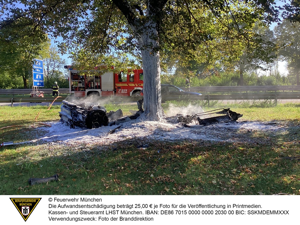 Ein Atemschutztrupp der Feuerwehr München löschte den brennenden Pkw mit einem Schaumrohr. Außerdem sicherten die Einsatzkräfte die Unfallstelle ab und unterstützten bei der Fahrzeugbergung.