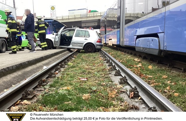 Aus der Feuerwehr unbekannter Ursache kam eine Fahrzeuglenkerin mit ihrem Pkw nach links von der Arnulfstraße ab, als sie stadteinwärts unterwegs war. Sie kollidierte hierbei mit dem dortigen Wartehäuschen der Tram-Haltestelle, wodurch dieses beschädigt wurde. Im weiteren Verlauf schleuderte der silberne VW weiter und kam schließlich mit dem Heck auf den Tramgleisen zu stehen. Daraufhin wurden von der Leitstelle mehrere Fahrzeuge der Feuerwehr und des Rettungsdienstes alarmiert. Als die ersten Kräfte eintrafen, übernahmen diese die Absicherung der Unfallstelle und bis zum Eintreffen des Rettungsdienstes die Erstversorgung der leichtverletzten Pkw-Lenkerin. Sie musste allerdings nicht in eine Klinik gebracht werden. Weitere Personen kamen nicht zu Schaden. Um die Gleise schnellstmöglich wieder für den ÖPNV freizumachen, wurde in Absprache mit den Verkehrsbetrieben eine pragmatische Lösung angestrebt. Das Unfallfahrzeug wurde mit einer Rundschlinge durch ein Hilfeleistungslöschfahrzeug aus dem Gleisbereich gezogen und die Einsatzstelle anschließend von kleineren Trümmern und ausgelaufenen Betriebsstoffen gereinigt.