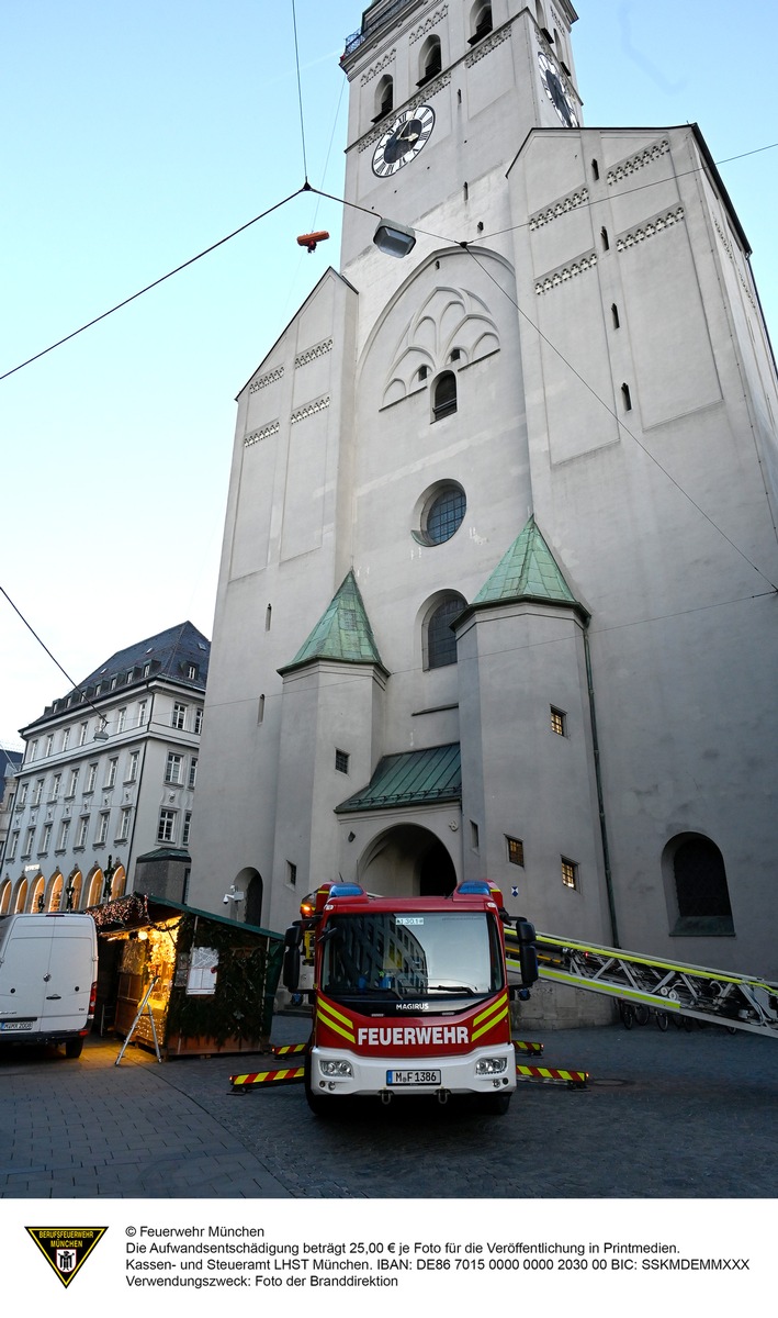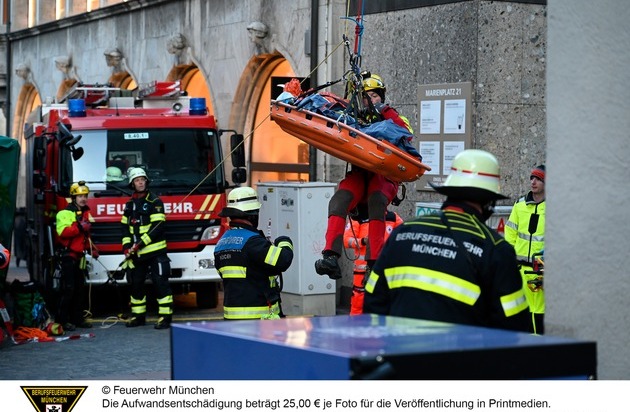 Eine Frau ist am Sonntagnachmittag von der Feuerwehr München gerettet worden. Aufgrund eines medizinischen Notfalls musste sie von der Aussichtsplattform des Alten Peter abgeseilt werden.