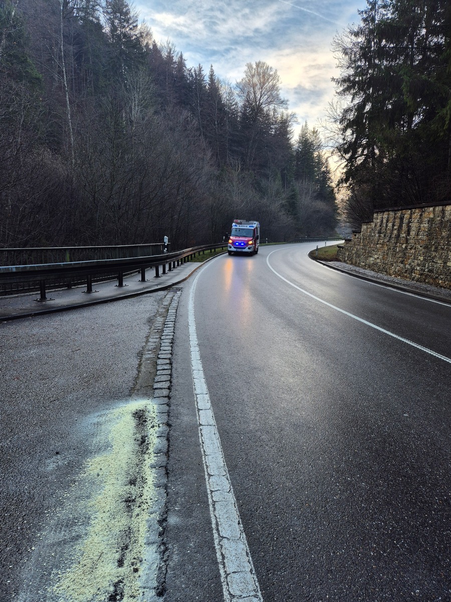 Die Abteilung Hoppetenzell der Freiwilligen Feuerwehr Stockach wurde am 29.11.2025 um 11:57 Uhr mit dem Einsatzstichwort G1 Ölspur außerorts dringend auf B313 in Fahrtrichtung Meßkirch alarmiert.