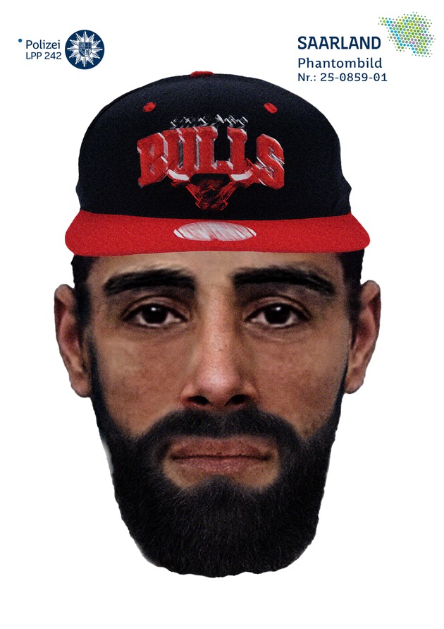 Personenbeschreibung: Männlich, südländisches Erscheinungsbild, dunklere Hautfarbe, ca. 35 Jahre alt, ca. 165-170cm groß, normale Statur, schwarze kurze Haare, gepflegter schwarzer Vollbart, bekleidet mit dunkler Steppjacke, blauer Jeanshose und schwarzen Turnschuhen. Auf dem Rücken der Jacke befand sich ein heller Aufdruck oder eine Stickerei. Zudem trug der Täter eine schwarze Basecap mit einem unbekannten Symbol an der Front und einem komplett oder teilweise roten Mützenschirm. Der Täter könnte außerdem Narben im Gesicht haben.