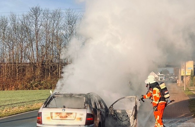 Freitag Vormittag wurde die Feuerwehr Minden zu einem PKW- Brand in den Stadtteil Meißen alarmiert. Bereits auf der Anfahrt konnten die Einsatzkräfte eine Rauchsäule wahrnehmen. Bei Eintreffen stand der gemeldetete PKW auf der Straße stehend bereits im Vollbrand. Die Insassen hatten das Fahrzeug bereits selbständig und unverletzt verlassen. Ein sofort zur Brandbekämpfung eingesetzter Trupp der Feuerwehr ging unter schweren Atemschutz mit einem C- Rohr vor und konnte den Brand schnell löschen. Im Einsatz war die Berufsfeuerwehr mit zwei Fahrzeugen und 7 Einsatzkräften. Zur Sicherung der Einsatzstelle/ Löschmaßnahmen musste die Cluß durch die Polizei kurzzeitig voll gesperrt werden.