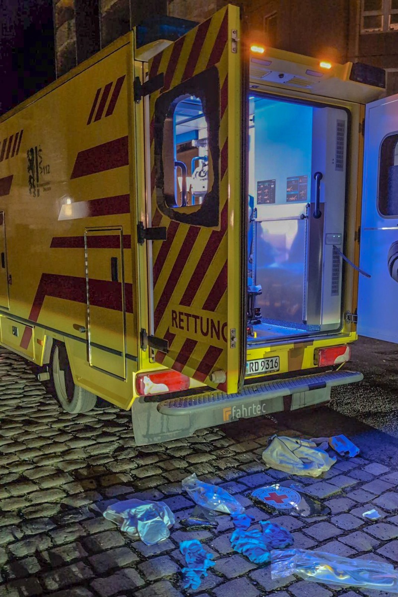 Am Abend wurden die Besatzung eines Rettungswagens der Rettungswache Neustadt sowie das Notarzteinsatzfahrzeug der Feuer- und Rettungswache Albertstadt zu einem medizinischen Notfall in die Dresdner Neustadt alarmiert. Während der Versorgung des Patienten (37) im Rettungswagen begann dieser plötzlich, die Einsatzkräfte massiv zu bedrohen und zu beleidigen. Als der Mann zudem damit begann übergriffig zu werden und das Interieur des Rettungswagens zu beschädigen, brachten sich die Einsatzkräfte umgehend in Sicherheit und setzten einen Notruf ab. Der Patient zerstörte in der Folge mehrere Scheiben des Fahrzeugs, entnahm diverse medizinische Gerätschaften und Taschen aus dem Rettungswagen und flüchtete anschließend vom Einsatzort. Hinzugezogene Kräfte der Feuer- und Rettungswache Albertstadt verfolgten den flüchtigen Mann und konnten ihn wenige Straßen weiter stellen. Dort wurde er durch bereits eingetroffene Polizeikräfte überwältigt.