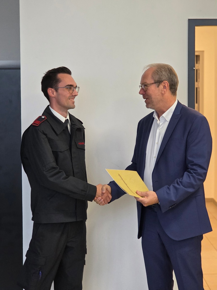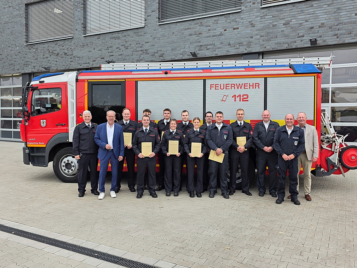 Elf hauptamtliche Feuerwehrleute erhielten aus den Händen des Bürgermeisters ihre Ernennungsurkunde zum Beamten auf Lebenszeit:
