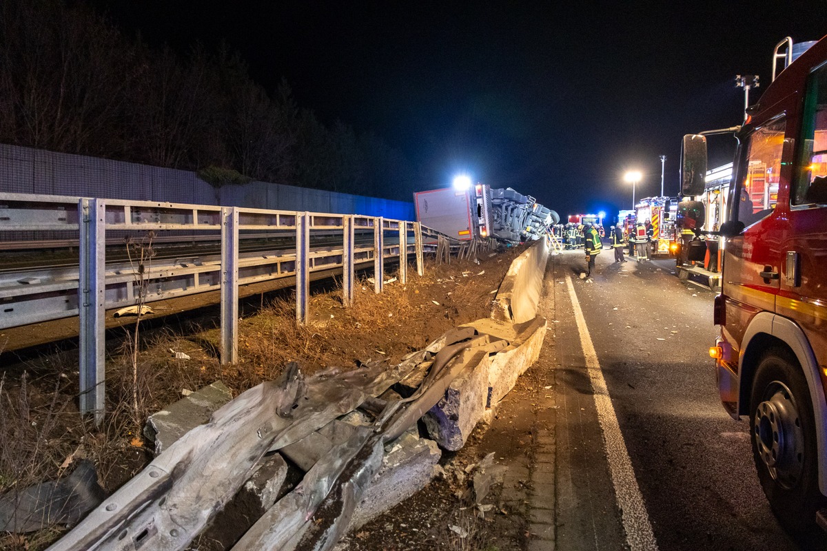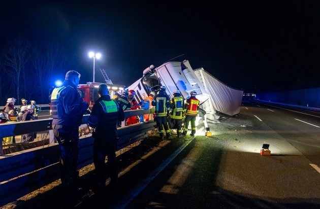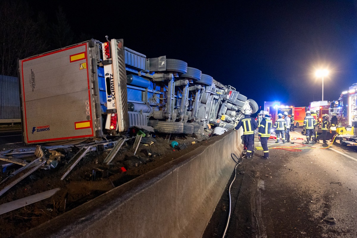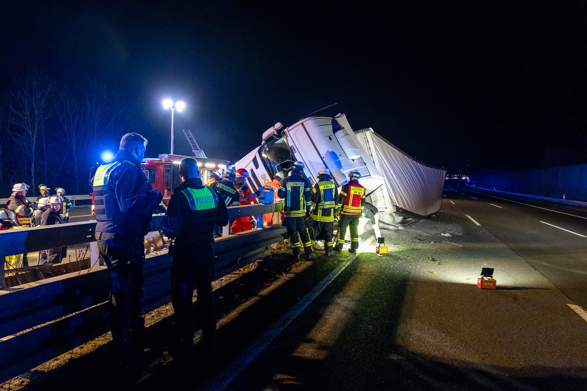 Porta Westfalica/A2. Die Freiwillige Feuerwehr Porta Westfalica wurde am Dienstag, 16.12.2025, gegen 03:35 Uhr zu einem schweren Verkehrsunfall mit einer eingeklemmten Person alarmiert. In Fahrtrichtung Hannover war ein Sattelzug verunfallt und im Mittelstreifen umgestürzt. Der LKW-Fahrer war eingeklemmt und lebensgefährlich verletzt. Er wurde durch die Feuerwehr befreit.