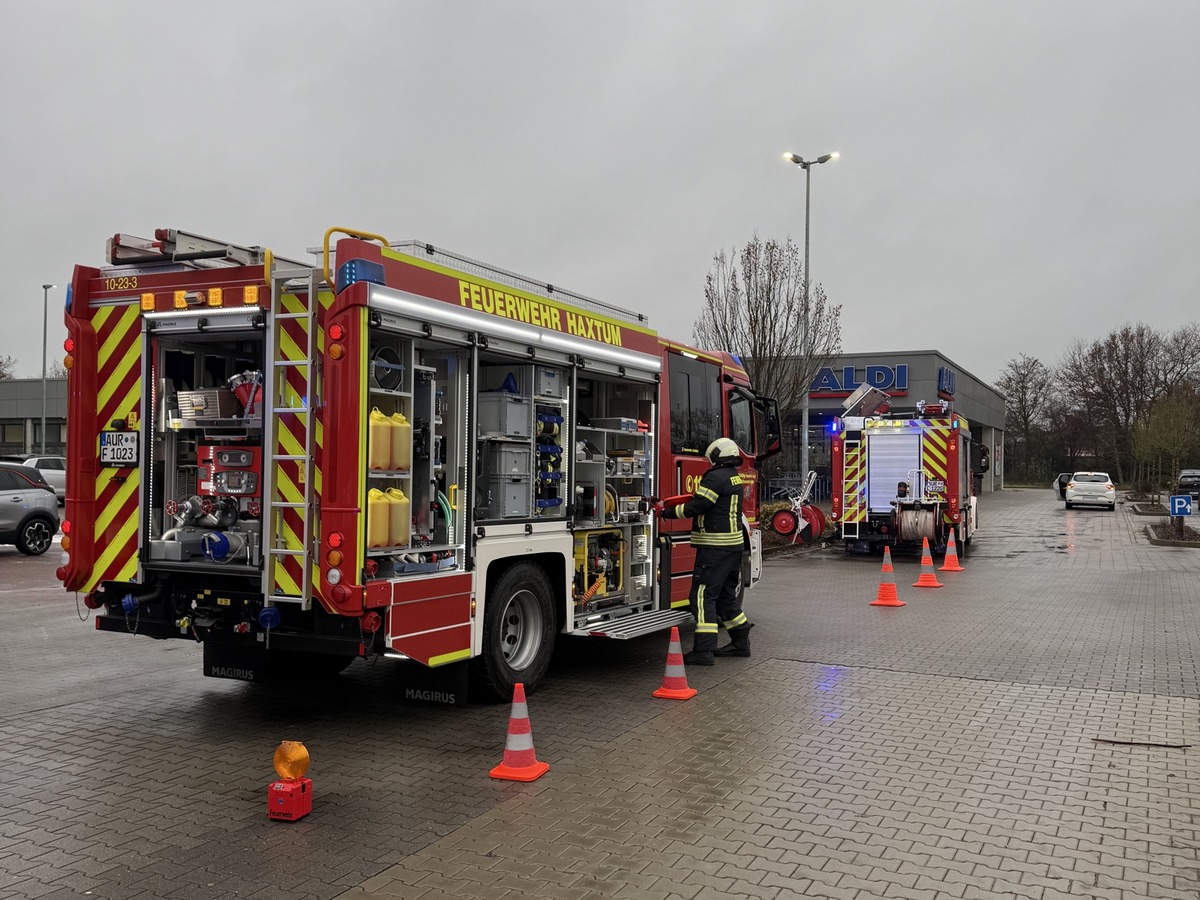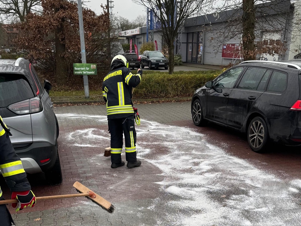 Auf dem Parkplatz eines Geschäfts für Tierbedarf am Dreekamp hat ein Fahrzeug in den frühen Samstagnachmittagsstunden einen Ölfilm hinterlassen. Dieser breitete sich rasch über mehrere Stellplätze aus und drohte durch einen naheliegenden Einlass der Oberflächenentwässerung in diese einzudringen. Alarmierte Einsatzkräfte der Feuerwehr Haxtum setzten umgehend Bindemittel ein und streuten dies zunächst im Nahbereich des gefährdeten Gullys aus, um das Abfließen des Öls zu verhindern. Im Anschluss erfolgte die großflächige Ausbringung des Binders auf die betroffenen Parkflächen, ehe die Reste zusammengefegt und aufgenommen wurden. Der Einsatz der mit drei Fahrzeugen angerückten Feuerwehrkräfte war nach gut 45 Minuten beendet.