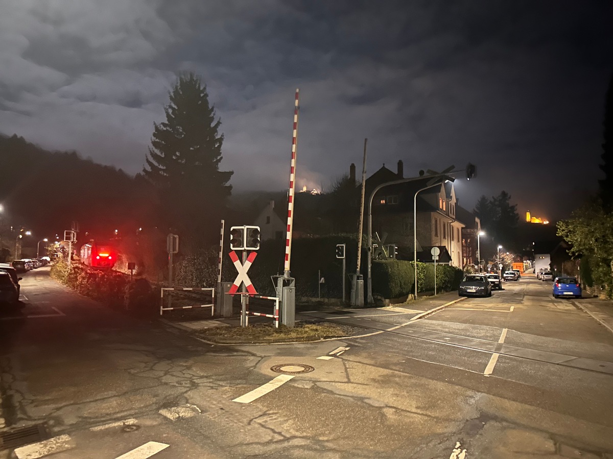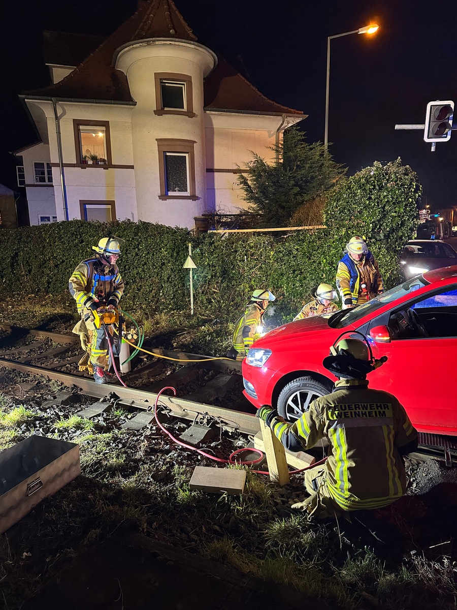 Am Freitagabend bot sich an der Bergstraße in Weinheim ein ungewöhnliches Bild und für einen Stunde den Bahnverkehr stilllegte. Eine Fahrerin eines Volkswagen wollte rechts in die Nibelungenstraße abbiegen. In der Dunkelheit und durch den Verlauf des Bahnübergangs orientierte sie sich jedoch falsch. Sie bog nicht über die reguläre Fahrspur auf die Nibelungenstraße ab, sondern direkt auf dem Bahnübergang. Nach wenigen Metern setzte der Wagen durch den deutlichen Höhenunterschied auf und kam mitten auf den Gleisen zum Stillstand. Das Fahrzeug setzte auf. Ein eigenes Zurückfahren war unmöglich. Die Fahrerin blieb ruhig und der Notruf wurde abgesetzt. Die Polizei Weinheim traf als erste ein, sicherte die Einsatzstelle und veranlasste die sofortige Sperrung der Bahnlinie, damit kein Zug in die Unfallstelle hineinfahren konnte. Schon kurz darauf forderten die Polizeibeamten die Feuerwehr nach, da ohne technische Unterstützung keine sichere Bergung möglich war. Die Einsatzkräfte der Feuerwehr leuchteten die Unfallstele großflächig aus. Mit Hebekissen und Unterbaumaterial schufen sie Stück für Stück neuen Halt unter dem VW. Zentimeterweise hob die Löschgruppe das festgefahrene Fahrzeug an, stabilisierte es mit Unterbaumaterial und stellte so wieder genügend Bodenfreiheit her, um den Wagen schonend aus dem Gleisbereich zu bewegen. Präzise wurde die Hebekissen eingesetzt, um das das Fahrzeug sicher anzuheben. Rund eine Stunde war die Bahnstrecke gesperrt. Nachdem der Volkswagen von den Schienen entfernt worden war, gab die Polizei Weinheim über die Deutsche Bahn die Strecke wieder frei. Am Fahrzeug entstand geringer Sachschaden. Die Fahrerin blieb unverletzt. Die Insassen der Bahn mussten im Zug warten, bis die Strecke wieder freigegeben war und konnten im Anschluss ihre Fahrt zum Weinheimer Bahnhof fortsetzen.