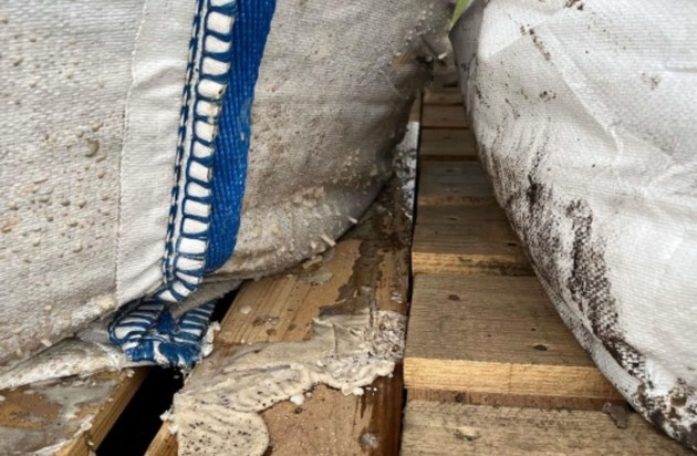 Die Kontrolle zeigte, dass die Behälter nicht ordnungsgemäß gesichert waren. Sie standen lose auf Holzpaletten, ohne fest verbunden zu sein. Teilweise bestanden große Lücken zwischen den einzelnen Paletten, wodurch sich die Ladung während der Fahrt bewegen konnte. Ein Behälter war bereits in Schieflage und drohte von der Palette zu rutschen. Zudem waren mehrere Paletten beschädigt.