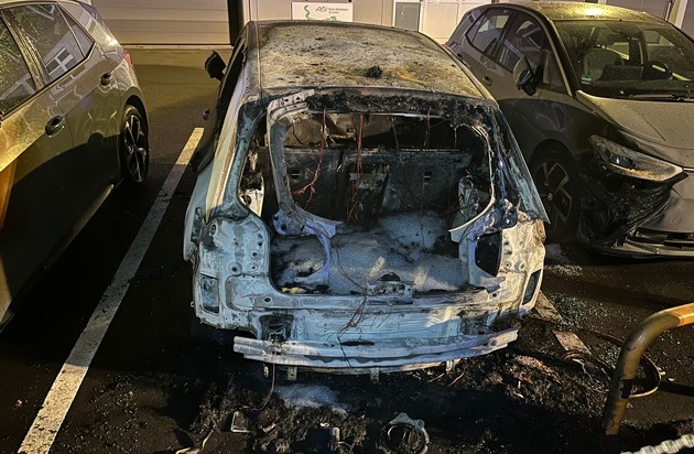 Ein aufmerksamer Zeuge meldete gegen 22:45 Uhr einen in Brand stehenden hellgrauen VW ID.3 an der Goethestraße in Höhe der Hausnummer 18. Einsatzkräfte der Feuerwehr Mettmann waren schnell vor Ort und konnten den Brand löschen. Dennoch brannte der VW vollständig aus. Zudem wurden zwei daneben geparkte VW ID.3 und eine Ladesäule für Elektrofahrzeuge durch das Feuer leicht beschädigt. Der Gesamtschaden wird auf einen mindestens mittleren fünfstelligen Betrag geschätzt.