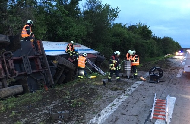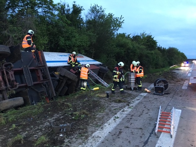 (clk.) Heute früh, Dienstag, 16. Mai 2017, um 4:30 Uhr wurde die Integrierte Regionalleitstelle Hildesheim über einen Verkehrsunfall mit einem LKW auf der A 7 in Fahrtrichtung Kassel kurz hinter der Auffahrt Hildesheim informiert. Es wurden sofort Kräfte der Berufsfeuerwehr entsandt. Vor Ort wurde festgestellt, dass ein mit 20 Tonnen Frischfleisch beladener LKW mit Anhänger von der Fahrbahn abgekommen war und auf der Seite lag. Weitere Fahrzeuge waren nicht beteiligt. Der 62-jährige Fahrer des LKW war verletzt in seiner Fahrerkabine eingeschlossen und musste durch die Feuerwehr befreit und dem Rettungsdienst übergeben werden. Außerdem lief an einem beschädigten Zusatztank für das Kühlaggregat des Anhängers Dieselkraftstoff aus. Dieser wurde sofort aufgefangen und der restliche Inhalt des Tanks umgepumpt.